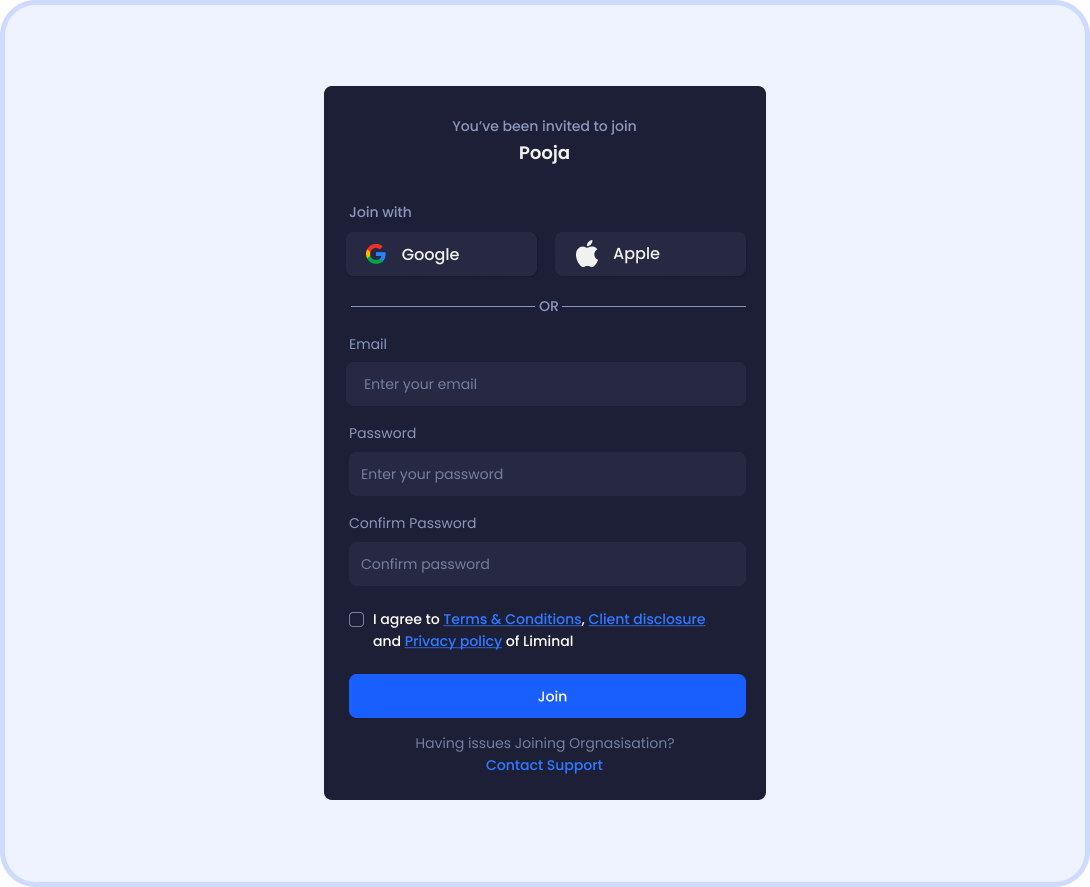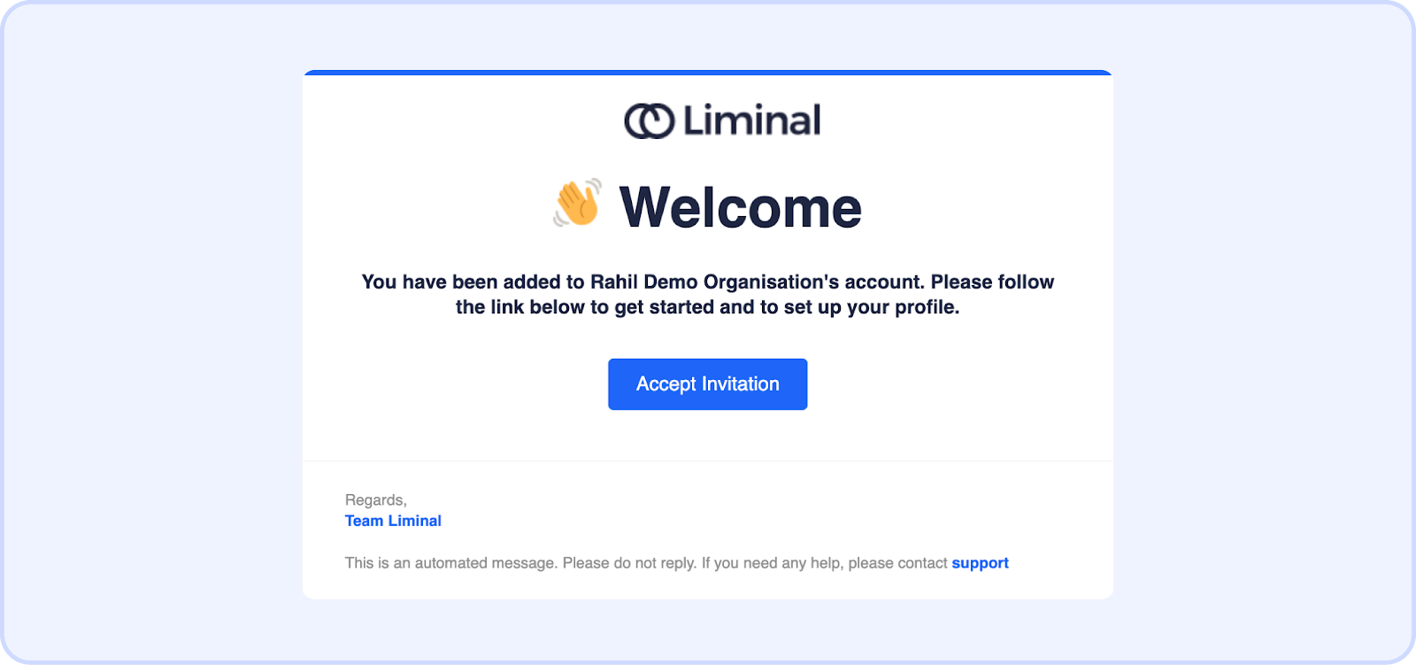 Liminal custody team members will invite users to join the customer organization based on the Board Resolution (BR) submitted by the customer during the KYB process.
