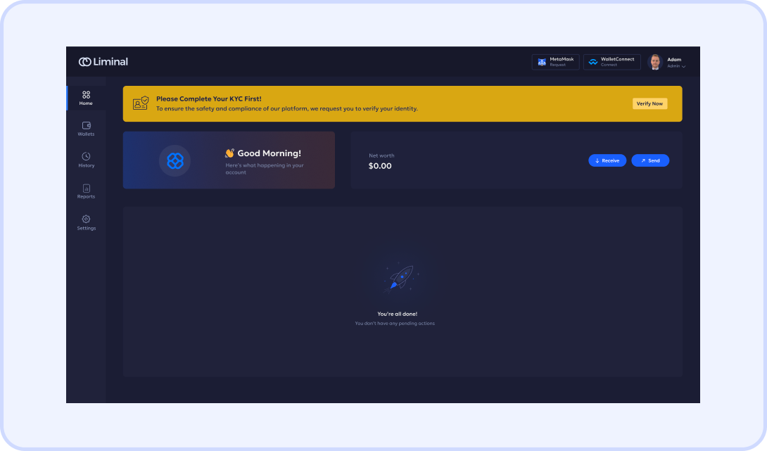 To access all dashboard features, users must complete a KYC verification, including submitting identification, proof of address, and a selfie. Upon approval, users will gain full access to the platform's functionalities.