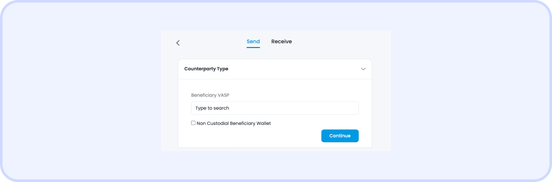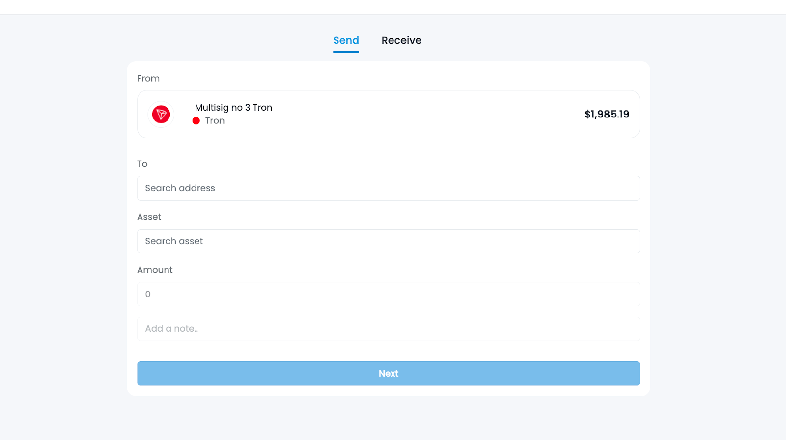 - Click the "Send" button, either from the home page or within a specific wallet on the Wallet page.