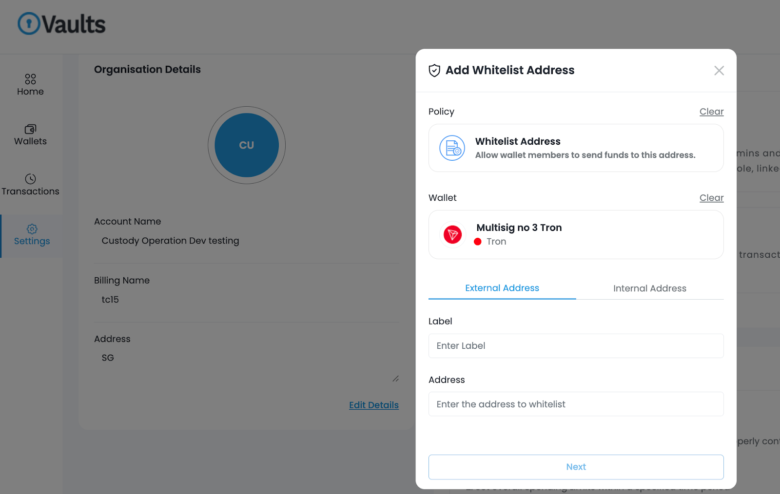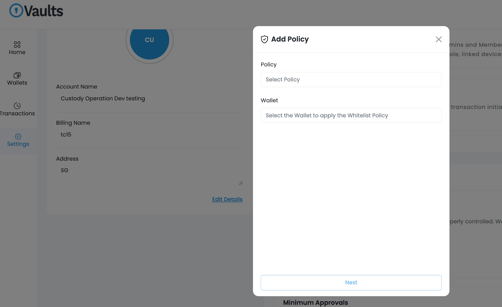 - In "Settings", find the "Policy Rules" section and click “Add” to start the Whitelist Address process.