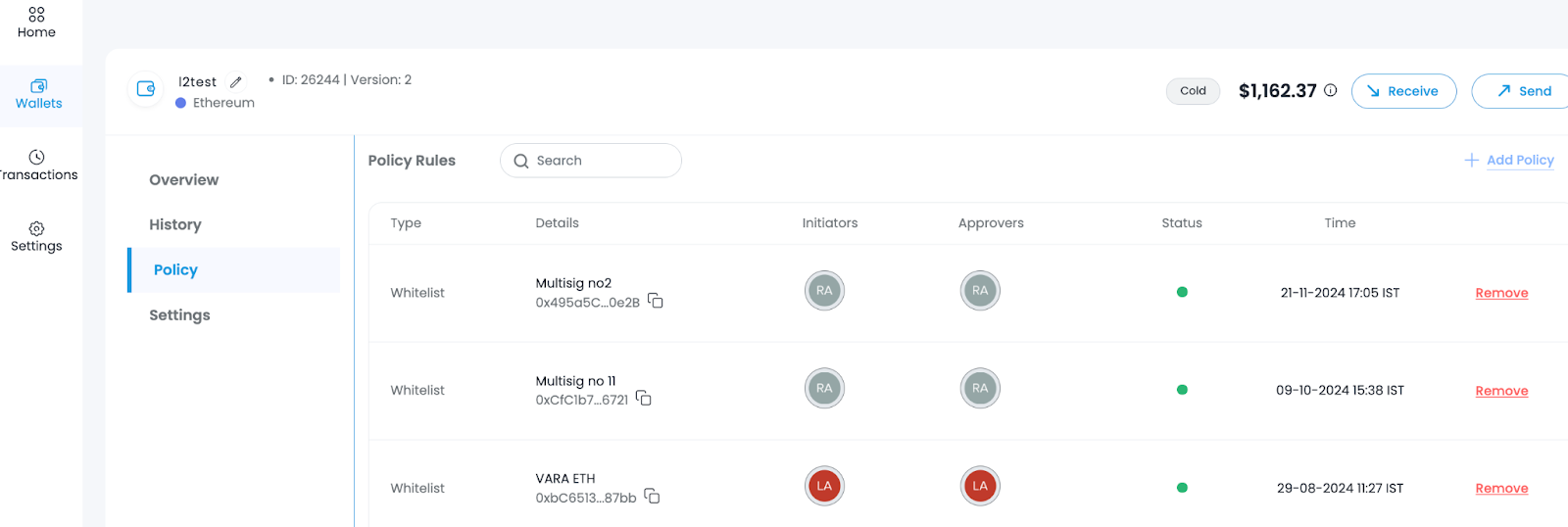 - After setting up the policy, you can view all whitelisted addresses by clicking on "View" under the Policy Rules section.