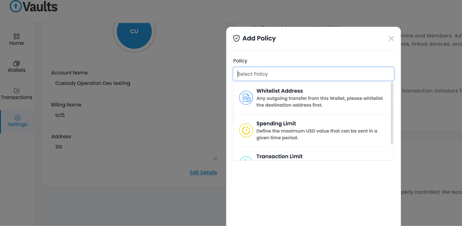 - Choose "Whitelist Address" as the policy type and select the desired "Wallet" for the transaction.