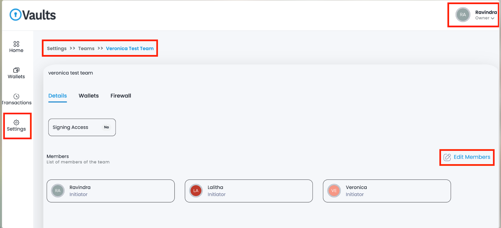 To change a team's members, go to Settings and select the team. Add or remove members as needed, then complete 2FA verification to finalize the changes.